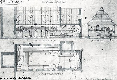 Situationsplan der Crainfelder Kirche mit Schnitt und Grundriss der Emporen aus dem Jahr 1858.